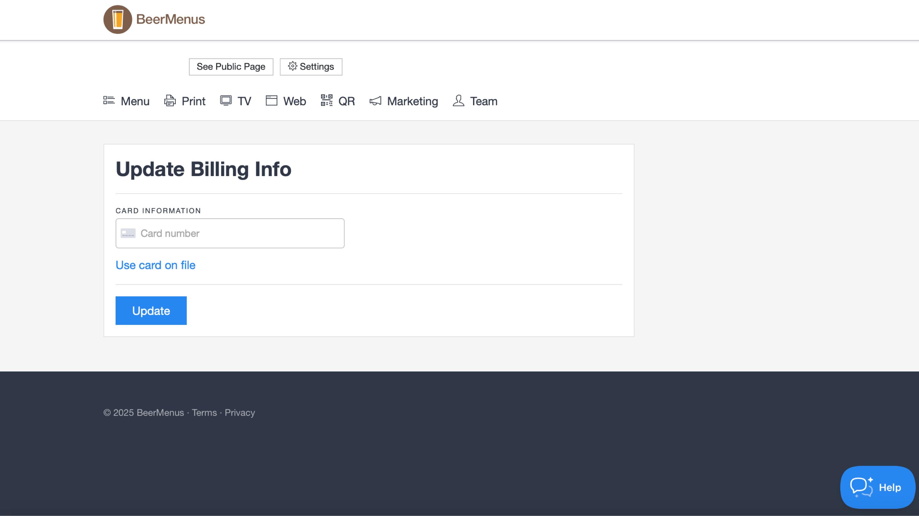 BeerMenus offers you the ability to pay with a Credit Card, or through ACH payment.