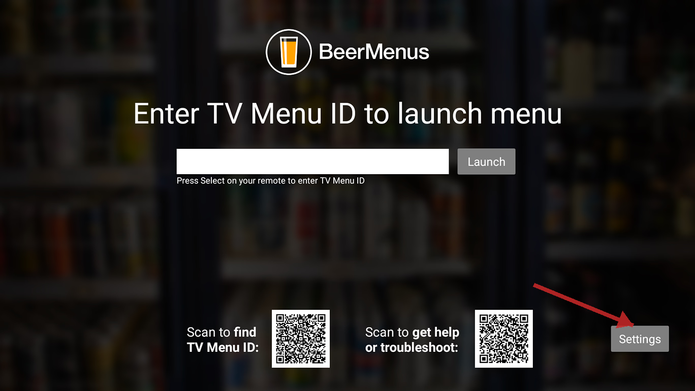 Step 1: Open the BeerMenus TV App and select the settings tab on the bottom right of the screen.